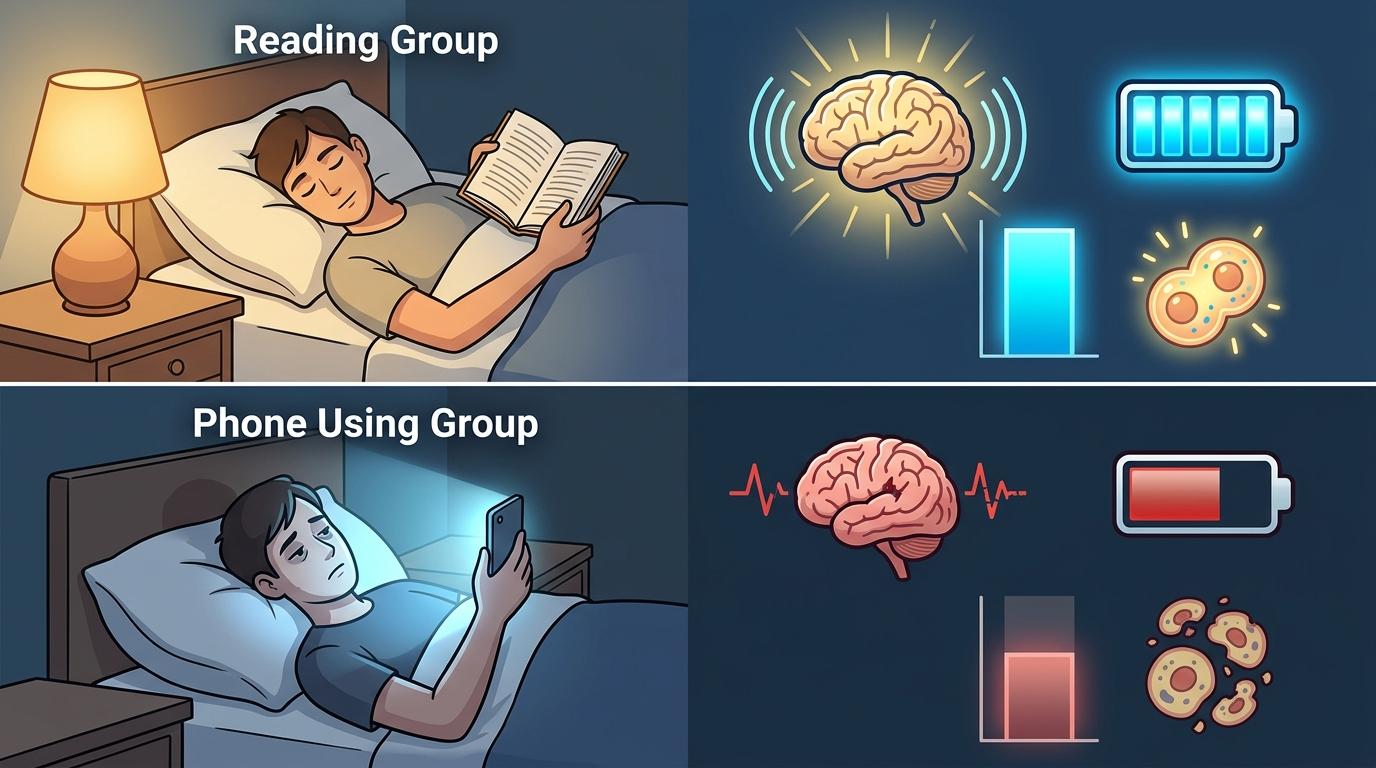 宾夕法尼亚州立大学的研究团队做过一个实验:让两组人睡满8小时,一组睡前刷1小时手机,另一组读纸质书。结果显示,刷手机的人慢波睡眠时间少了20%——慢波睡眠就是我们常说的深度睡眠,是身体进行细胞修复、代谢恢复的核心阶段,相当于给身体做「系统更新」。