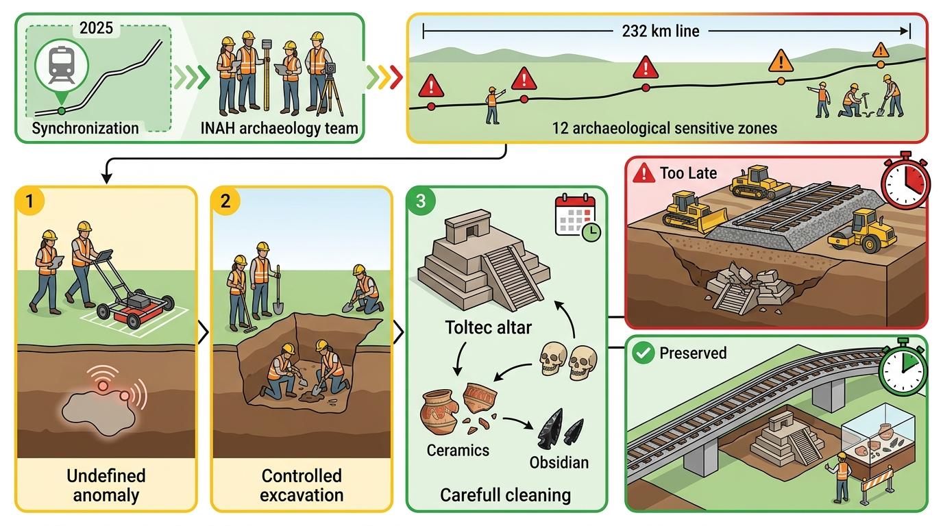 在墨西哥城-克雷塔罗高铁项目中,国家人类学与历史研究所(INAH)的团队从2025年4月工程启动时就同步进场,沿着232公里的线路排查出12处考古敏感区。这次发现的托尔特克祭坛,就是在一段计划下月动工的路段下挖出的:考古队用地质雷达扫到异常后,仅用45天就完成了初步发掘,清理出祭坛、4具头骨和陶器、黑曜石等文物。如果再晚一个月,这些距今1000年的遗迹就会被埋在路基之下。