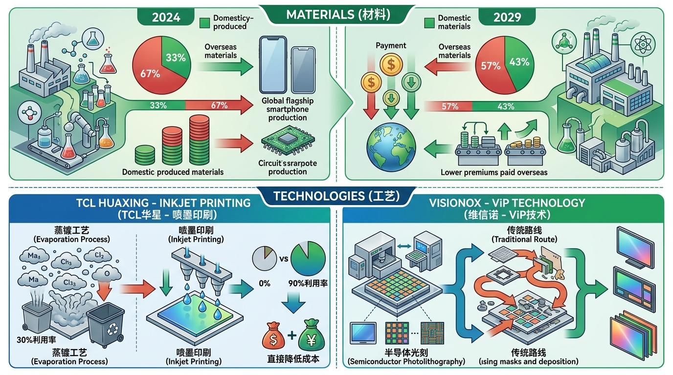 在材料端,2024年起中国本土OLED发光材料开始打入全球旗舰手机供应链,预计到2029年,国产材料占比将从33%提升到43%——这意味着每生产一块OLED面板,就能少给海外厂商交一笔溢价。在工艺端,TCL华星布局的喷墨印刷OLED技术,把材料利用率从传统蒸镀工艺的30%提升到了90%,直接降低了生产成本;维信诺的ViP技术,用半导体光刻工艺定义像素,绕开了日韩的传统路线。