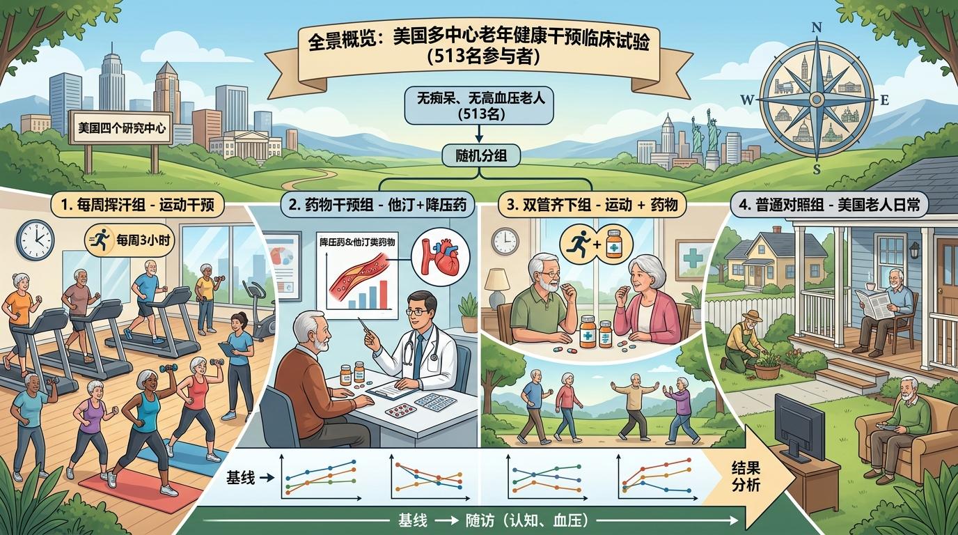 这项覆盖美国四个研究中心的试验,像一场严谨的“老年生活模拟”:513名无痴呆、无高血压的老人被随机分成四组——一组每周挥汗3小时,一组吃他汀加降压药,一组运动吃药双管齐下,最后一组完全复刻美国普通老人的日常。