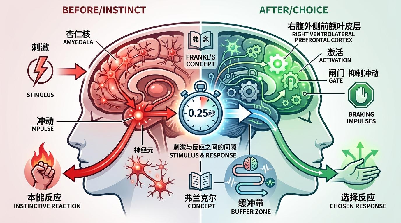 他后来才懂,那半圈指尖的停顿,不是迟钝,是在激活大脑里的“缓冲带”——刺激与反应之间的间隙。这个被维克多·弗兰克尔最早提出的“空间”,如今被神经科学证实:当外界的情绪信号撞进杏仁核,右腹外侧前额叶皮层会像闸门一样启动,给冲动踩下刹车。这0.25秒的延迟里,大脑不是在空转,是在把“本能反应”切换成“选择反应”。
