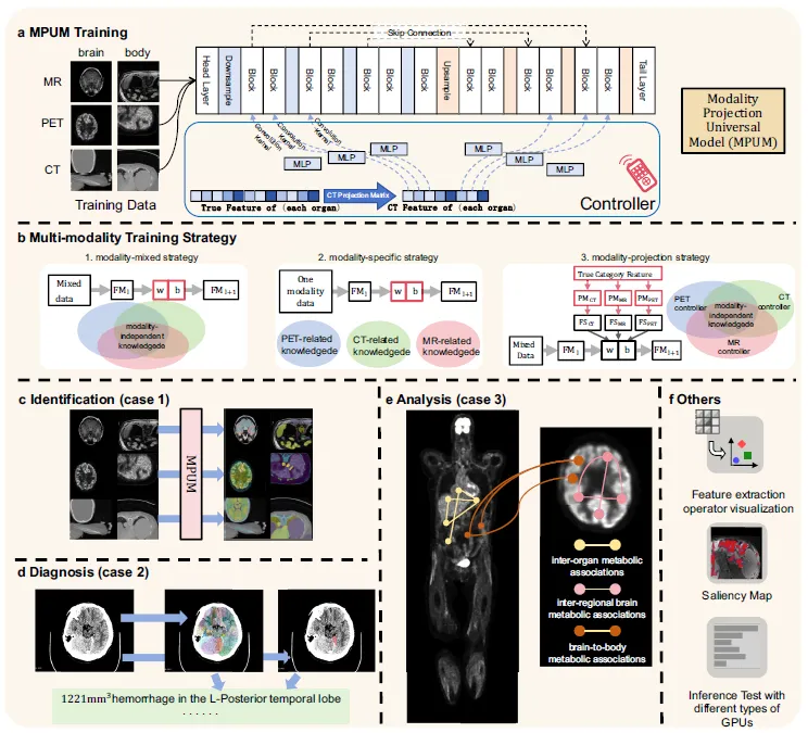 这个模型基于861名受试者的多模态全身影像数据训练而成,其核心突破在于创新的**“模态投影”**策略。简单来说,模型不再为每种影像类型设计一套独立的分析流程,而是学习一种更为本质、超越具体模态的深层生物学特征表达。当面对CT图像时,它能自动调用与解剖轮廓相关的“知识”;切换到MR图像时,则侧重于软组织对比的“理解”;面对PET图像,又能聚焦于代谢信号的“解读”。