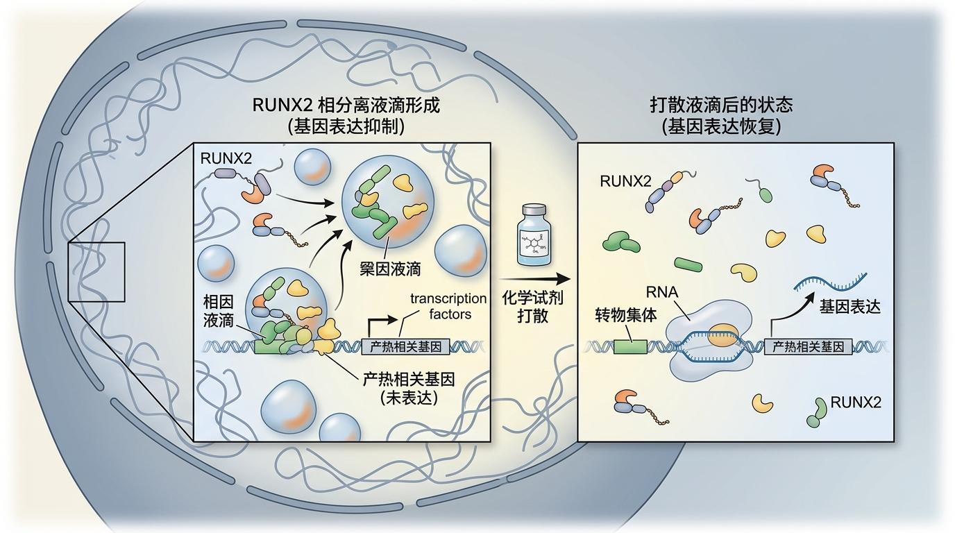 RUNX2的路子则更“高端”,它靠的是“相分离”——就像把一堆乐高积木倒进水里,密度大的会沉底聚成一团。RUNX2自带一段没有固定结构的“柔软尾巴”,能在细胞里自发聚成一个个小液滴,把产热相关的转录因子和调控元件全“关”进这些液滴里,让它们没法接触到基因。只要用化学试剂打散这些液滴,产热基因的表达立刻就能恢复大半。
