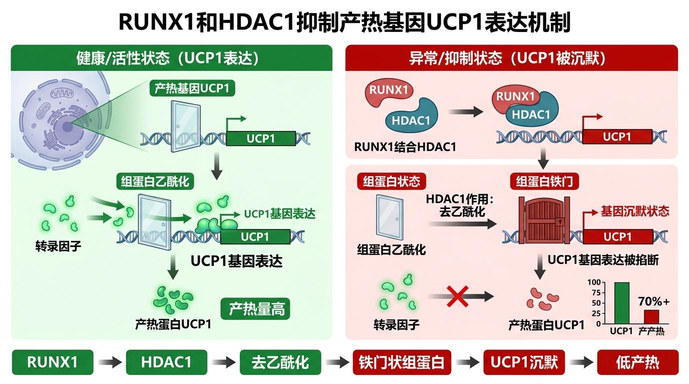 先看RUNX1,它是个“搞装修的”——会找来组蛋白去乙酰化酶HDAC1,给产热基因的“家门”刷上一层“黑漆”。这里的组蛋白乙酰化,就像是给基因的调控区安上一扇透明玻璃门,能让转录因子轻松进去启动基因;而HDAC1的作用,就是把这扇玻璃门换成密不透风的铁门,让产热基因彻底“沉默”。实验数据显示,RUNX1一旦和HDAC1结合,产热基因UCP1的表达量会直接下降70%以上,相当于把派对的主电源给掐了。
