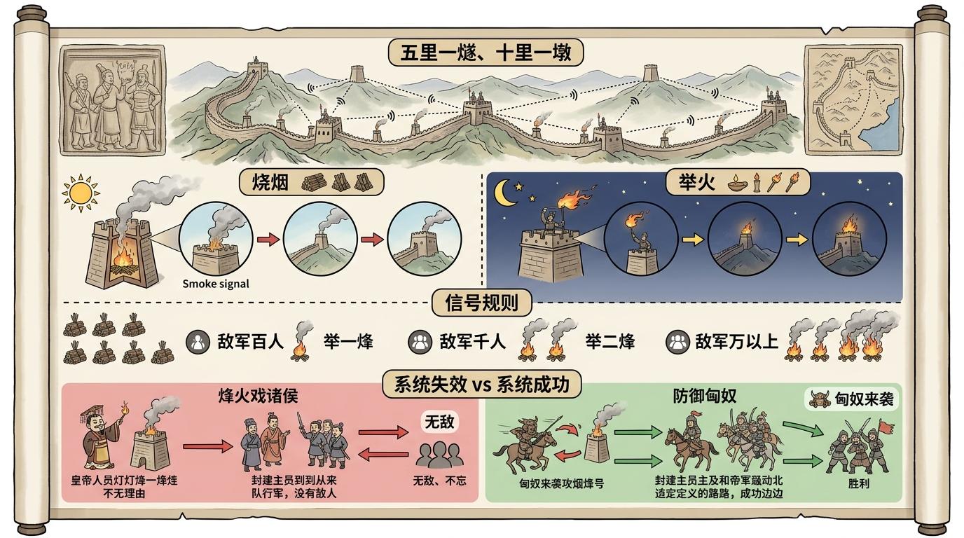 “烽火戏诸侯”的技术漏洞,藏在汉代成熟的烽燧报警体系里。这套为抵御匈奴建立的国防系统,是中国历史上首个规模化的烽火预警网络——“五里一燧、十里一墩”,白天烧烟、夜晚举火,信号能在数小时内传遍数百公里防线,每座烽燧都有专职官兵值守,信号规则严格到规定“敌军百人举一烽,千人举二烽”。