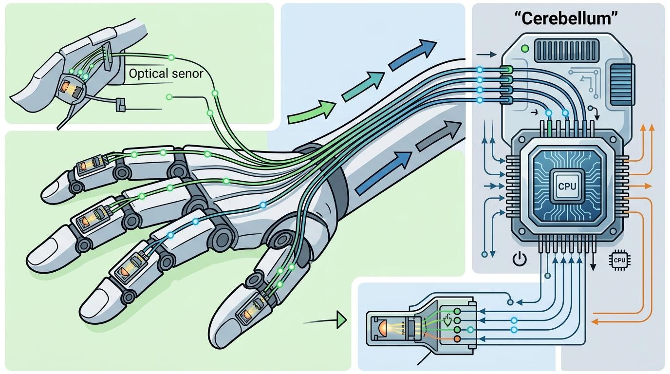而光学分布式力觉系统采用了集中式架构——所有光学传感器的信号,都像神经信号汇聚到大脑一样,统一传到机器人的「小脑」处理。