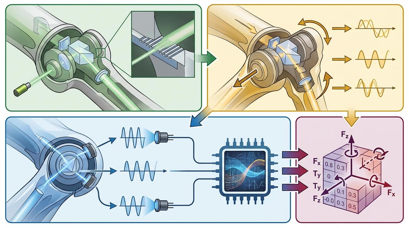 但真实的机制比这更精确:研究团队把光学元件直接集成进机器人的结构件里——关节的外壳、肢体的骨架本身就是传感器,无需额外加装笨重的模块。当机器人的关节转动、肢体受力时,光学元件会捕捉到光的波长或相位变化,再通过自研的解耦算法,把这些光信号翻译成精确的六维力数据。