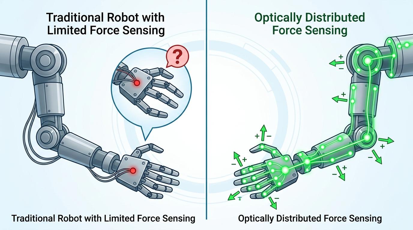 这套技术的源头,是工程师给大型桥梁做健康监测:在桥梁内部埋入光纤,通过光信号的细微变化,感知百吨级结构的应力和形变。当把这套思路用到机器人身上时,测量对象从百吨级变成了公斤级,但核心逻辑完全一致:力会改变材料的微观结构,进而改变光的传播路径,捕捉到这个变化,就能精准测量力。