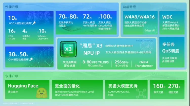如果说峰值算力(TFLOPS)是端侧AI芯片的“入场券”,那么如何将标称的算力高效地转化为实际性能,即“算力利用率”,才是真正的核心难题。安谋科技发布的“周易”X3,交出了一份惊人的答卷:相较于上一代产品,其在AIGC大模型上的能力实现了高达10倍的增长。这一跃升并非简单的堆料,而是源于一次深刻的架构变革。过去的AI芯片更擅长处理像人脸识别这类基于CNN(卷积神经网络)的任务,计算方式以定点运算为主。但生成式AI的基础架构Transformer,则更像一位依赖浮点(FP)运算的“数学家”。“周易”X3的前瞻性在于,其设计之初就预见了这一转变,采用了兼顾CNN与Transformer的通用架构,并全面强化了浮点运算能力,为大模型在端侧安家立业奠定了基石。更令人瞩目的是一组实测数据:在处理用户指令的Prefill阶段,“周易”X3的算力利用率高达72%,远超行业平均水平,意味着芯片在“思考”时没有“出工不出力”。而在生成内容的Decode阶段,它更是借助一项名为WDC的自研解压硬件,实现了“有效带宽利用率超100%”的奇迹。这听起来似乎违背物理常识,其背后的原理却很巧妙:大模型的权重数据可以被无损压缩存储,当NPU需要调用时,WDC硬件会进行实时、对软件透明的解压。这相当于在有限的物理带宽(公路)上,通过高效的“货物打包与拆解”,跑出了远超其物理限制的数据量,完美解决了大模型对数据吞吐量的渴求,堪称解决端侧带宽瓶颈的“独门武器”。
