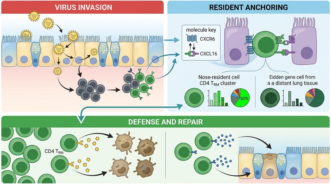 但真实的机制比这个类比更精确:当甲型流感病毒第一次入侵鼻腔后,部分CD4 T细胞会转化为这种‘常驻保安’,它们通过CXCR6-CXCL16信号轴这把‘分子钥匙’,牢牢锚定在鼻黏膜的上皮细胞之间。单细胞RNA测序显示,这些鼻腔里的CD4 TRM和肺部的同类细胞完全是两支部队——它们的基因表达谱差异显著,其中超过60%是Th17亚型细胞,专门负责分泌IL-17细胞因子,一边快速清除病毒,一边修复受损的黏膜组织。