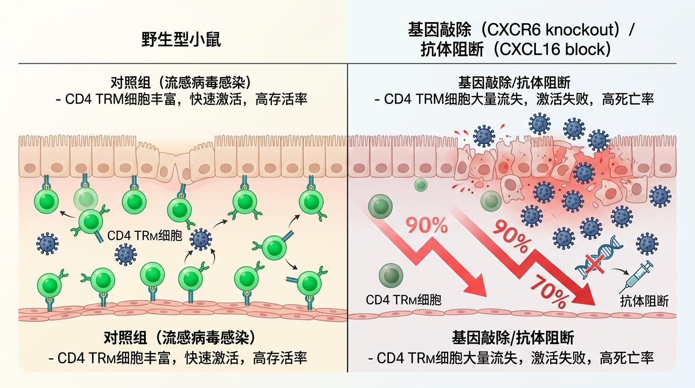 研究团队做了一组对照实验:当敲除小鼠体内的CXCR6基因后,原本能在鼻腔驻留的CD4 TRM细胞,会在3周内减少90%以上,剩下的细胞也会失去快速激活的能力。而如果用抗体阻断CXCL16的作用,鼻腔里的CD4 TRM同样会大量流失,小鼠面对流感病毒攻击时的死亡率会从10%飙升至70%。