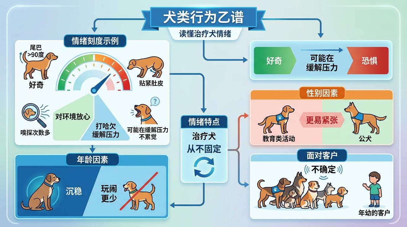 这套被称为犬类行为乙谱的工具,是读懂治疗犬情绪的核心。它把狗的每一个动作都对应到情绪刻度:比如尾巴举到90度以上是好奇,贴紧肚皮是恐惧;嗅探次数多说明它对环境放心,打哈欠却不一定是困——可能是在缓解压力。研究里最有意思的发现是,治疗犬的情绪从来不是固定的:年长的狗更少玩闹但更沉稳,母犬在教育类活动里会比公犬更易紧张,而面对年幼的客户时,几乎所有狗都会表现出明显的不确定。