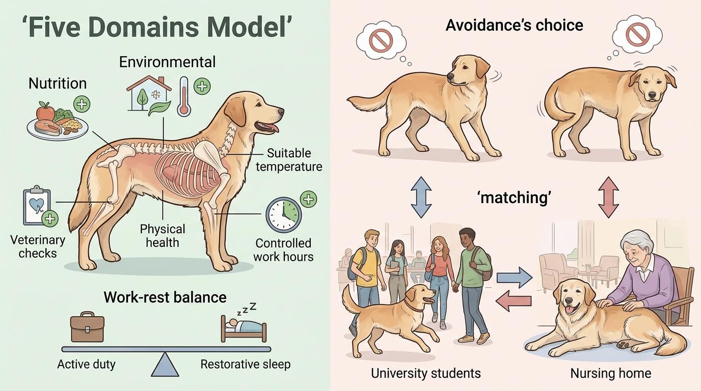 保障治疗犬的福祉,从来不是一句空话。国际上通行的「五域模型」早已把心理状态纳入评估:除了定期体检、合理安排工作时长,更重要的是给它们「说不」的权利——当狗表现出回避、夹尾巴时,责任人必须立刻暂停活动。而最关键的,是「匹配」:让好动的年轻狗去校园陪学生玩,让沉稳的老狗去疗养院安静陪伴,就像不会让一个内向的人去做脱口秀演员。