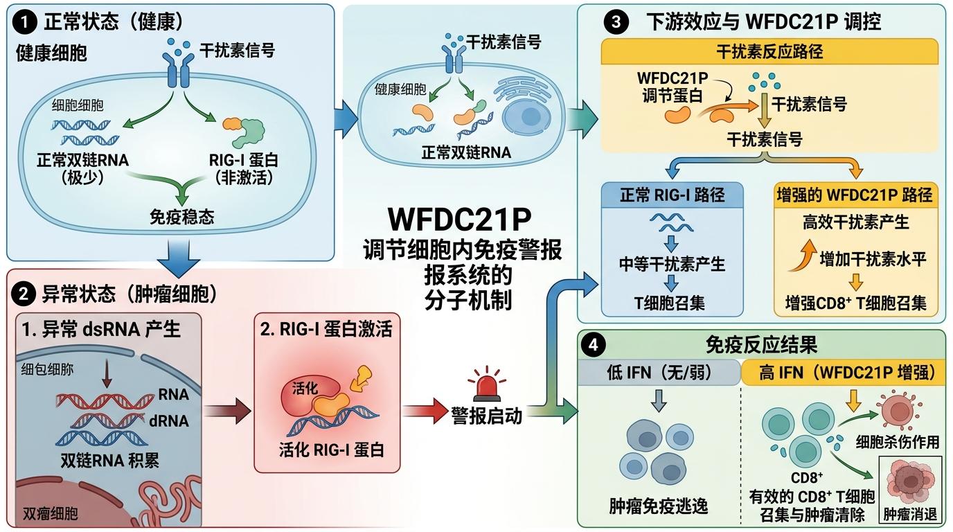 要理解WFDC21P的作用,得先搞懂细胞里的免疫警报系统:当肿瘤细胞里出现异常双链RNA时,一种叫RIG-I的蛋白会立刻识别,像拉响警报一样启动干扰素信号,召唤CD8⁺T细胞来消灭肿瘤。