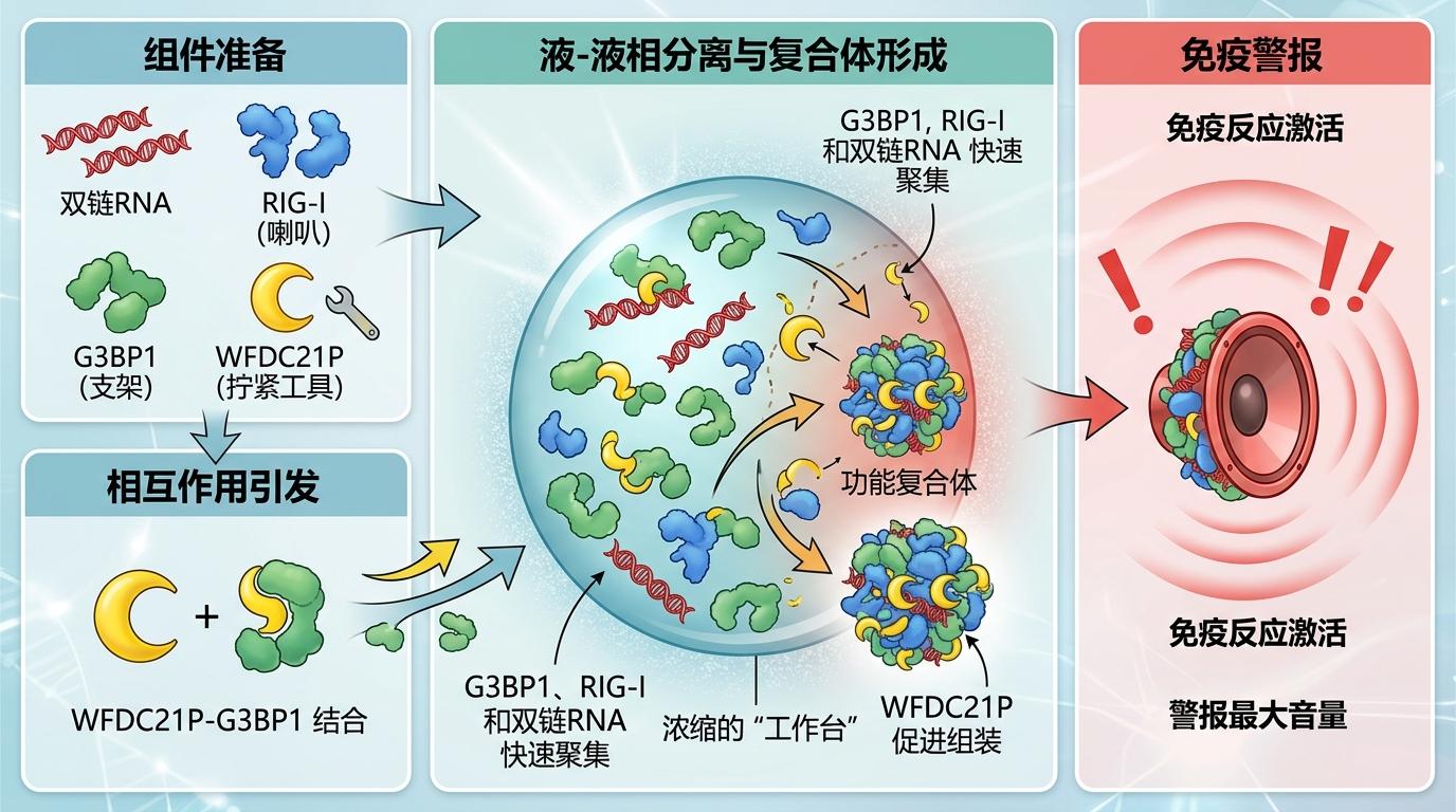 你可以把这个过程想象成组装应急广播:双链RNA是待播放的警报录音,RIG-I是喇叭,G3BP1是支架,WFDC21P就是快速把它们拧在一起的工具。它能直接和G3BP1结合,通过液-液相分离形成一个浓缩的“工作台”,让G3BP1、RIG-I和双链RNA快速聚集成功能体,瞬间把免疫警报拉到最大音量。