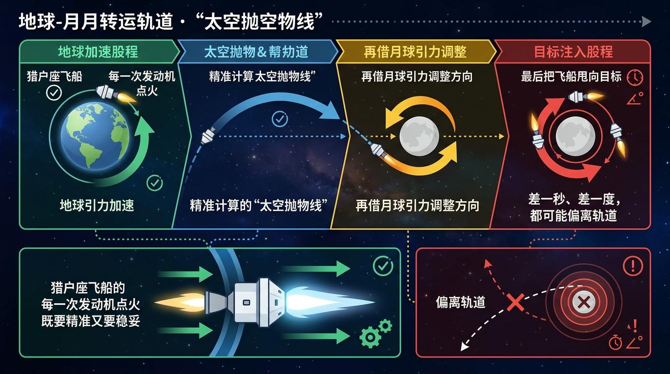 地月转移轨道,说穿了就是一条精准计算的“太空抛物线”:利用地球引力加速,再借月球引力调整方向,最终把飞船甩向目标。这不是简单的“开车上路”,而是在两个天体的引力拔河中找平衡,差一秒、差一度,都可能偏离轨道。猎户座飞船的每一次发动机点火,都像在刀尖上跳舞,既要精准又要稳妥。
