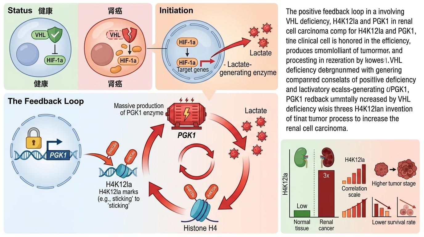 但真实的机制比这更精确:VHL缺陷的肾癌中,H4K12la会精准粘在糖酵解关键酶PGK1的基因启动子上,让PGK1的产量飙升。PGK1就像一台高速运转的乳酸发生器,产出的乳酸又会反过来给更多组蛋白加上H4K12la标记,形成“乳酸越多→标记越多→乳酸更多”的正反馈环。临床数据显示,肾癌组织里的H4K12la水平比正常肾组织高3倍以上,而且标记越多,患者的肿瘤分期越晚,五年生存率越低。