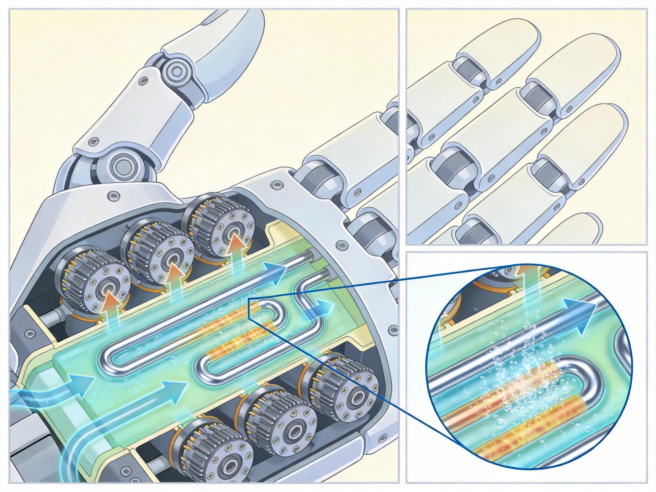 更值得关注的是「仿生汗腺」解决的散热难题。高密度电机集成在狭小的手部空间里,很容易因局部过热导致性能衰减甚至烧毁。这只手采用3D打印的金属液冷通道,像人类汗腺一样通过蒸发冷却带走热量,让100W的电机能长时间满负荷运行。这看似微小的设计,打破了人形机器人高负载作业的瓶颈——此前多数机器人手连续工作半小时就必须停机散热,现在能支撑整个班次的生产节拍。