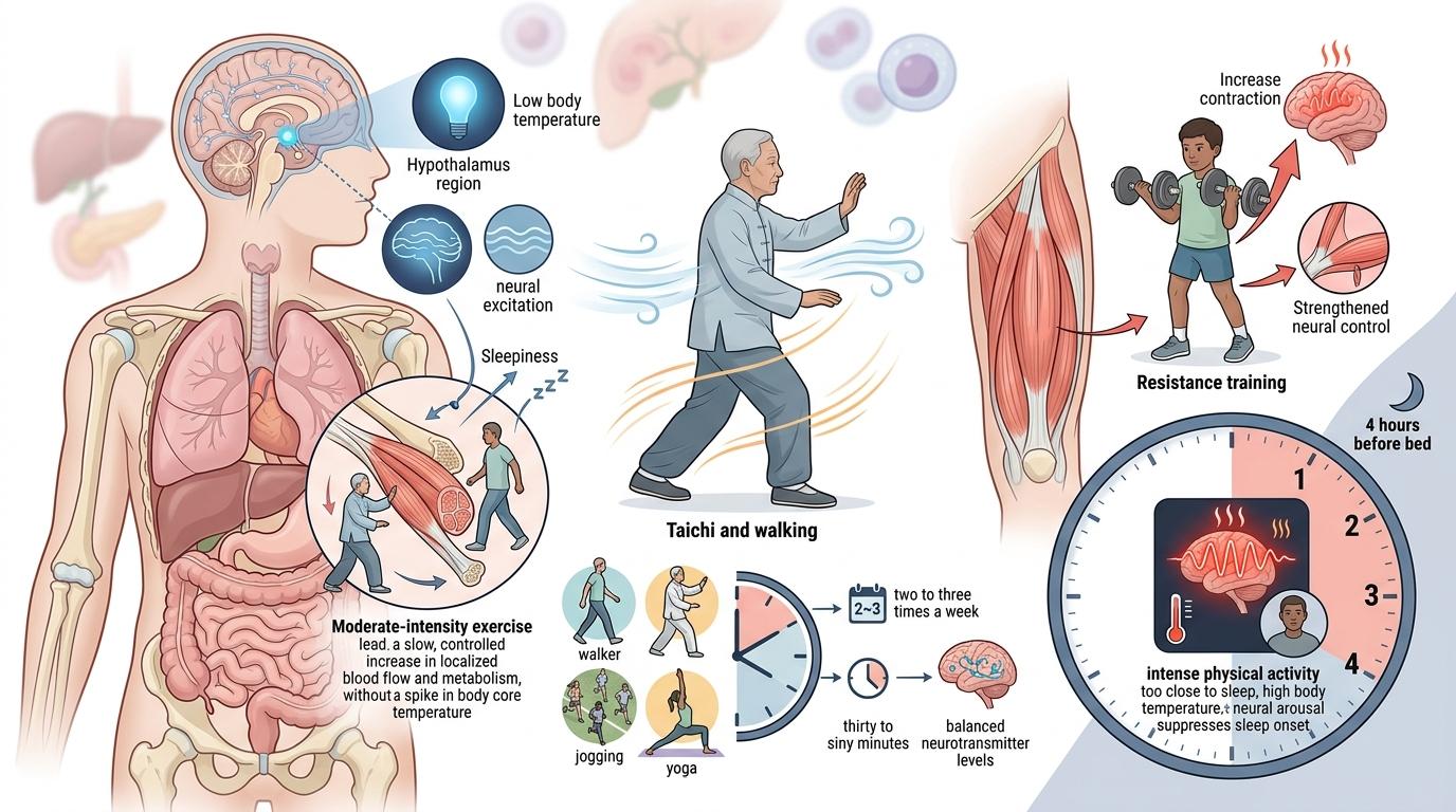 不用把运动想成要泡在健身房挥汗如雨的苦差事。研究里的有效方案,是每周两到三次、每次三十到六十分钟的中等强度运动——快走、慢跑、瑜伽甚至太极都算。对60岁以上的失眠老人来说,太极的效果不比有氧运动差;而被焦虑缠上的年轻人,阻力训练能更快帮他们找回对身体的掌控感。关键是别在睡前四小时内剧烈运动,那会让体温和神经兴奋度居高不下,反而把睡意赶跑。