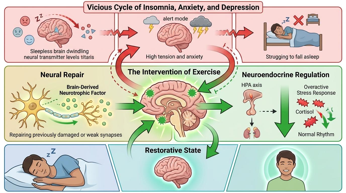 要理解运动的作用,得先看清失眠、焦虑和抑郁的死循环:失眠会榨干大脑里调节情绪的神经递质,让焦虑和抑郁趁虚而入;而紧绷的情绪又会让大脑始终处于“警戒模式”,连入睡都成了一场硬仗。运动的厉害之处,在于它能同时从几个节点砸开这个循环——它会促进脑源性神经营养因子的分泌,修复被失眠和情绪问题损伤的神经细胞;还能调低过度活跃的下丘脑-垂体-肾上腺轴,把居高不下的皮质醇拉回正常节律,让身体从“应激状态”切换到“休息模式”。