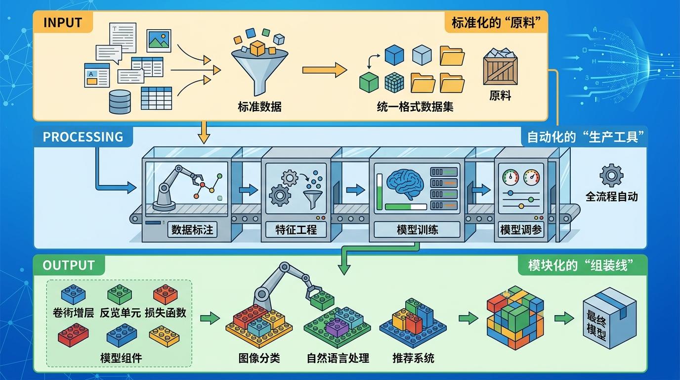 这条流水线的运转靠三个核心支柱:首先是标准化的“原料”,统一格式的数据集让模型训练不再像手工实验;其次是自动化的“生产工具”,从数据标注、特征工程到模型调参,全流程无需人工干预;最后是模块化的“组装线”,不同功能的模型组件可以像乐高积木一样自由拼接。