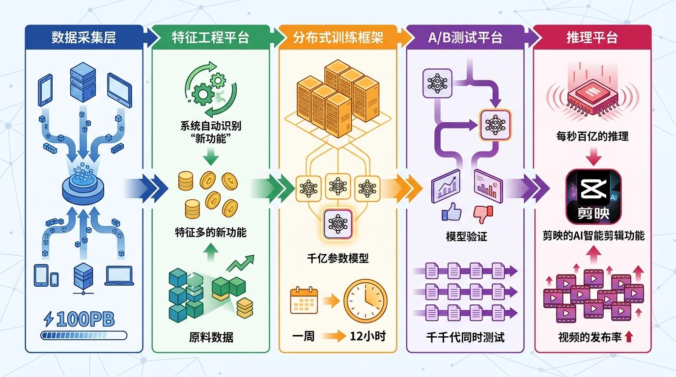 字节跳动的实践最能体现这种逻辑:数据采集层每天处理超100PB用户行为数据,特征工程平台自动识别能提升模型效果的新特征,分布式训练框架把千亿参数模型的训练时间从一周压缩到12小时,A/B测试平台每天能完成上万次模型验证,最后由推理平台支撑起每秒数十亿次的决策。这套流水线让剪映的AI智能剪辑功能从立项到上线只用了45天,用户视频发布率直接提升3倍。
