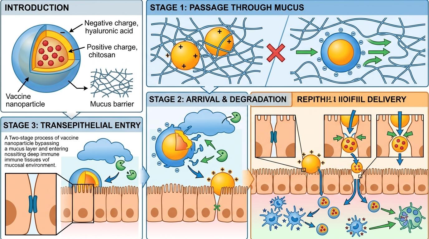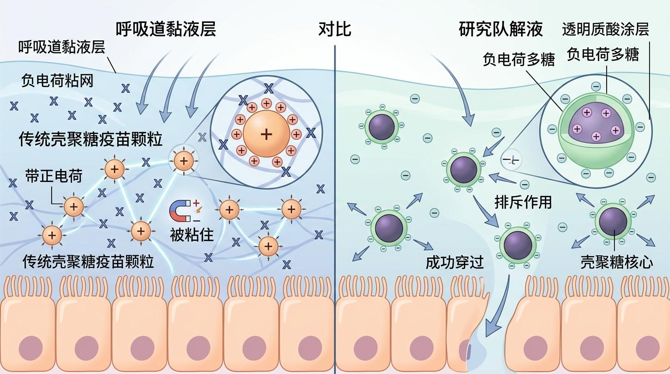 你可以把呼吸道黏液层想象成一张布满负电荷的粘网,传统的壳聚糖疫苗颗粒带着正电荷,一碰到就像磁铁吸铁块似的粘住,再也动不了。研究团队的解法是:给壳聚糖颗粒包上一层透明质酸——一种本身就在人体里存在的负电荷多糖,相当于给疫苗穿了件“同电荷的隐身衣”。