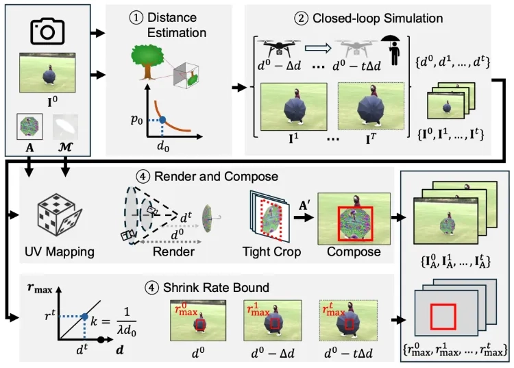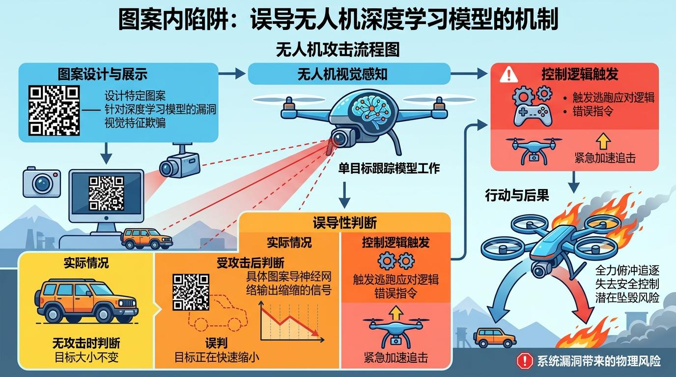研究团队设计的图案,能精准误导无人机的单目标跟踪模型,让它把正常大小的目标,错误地识别成正在缩小的状态。无人机的控制逻辑会瞬间启动:“目标在逃,必须追上”,于是不顾一切地俯冲过来。整个过程没有任何信号层面的操作,完全是利用了深度学习模型对特定视觉特征的脆弱性——就像给AI的“眼睛”里吹了一粒定制的沙子。