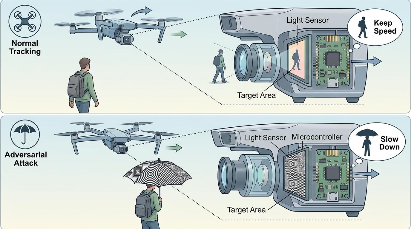 你以为关掉GPS干扰、屏蔽信号,无人机就万无一失了?2026年4月,加州大学尔湾分校的团队用一把印满奇怪图案的雨伞,彻底推翻了这个行业默认的安全假设。他们对着三款主流商用无人机撑开伞,原本稳稳跟拍的无人机突然像被“钓”着一样,猛地向人冲过来——没有信号干扰,没有黑客入侵,仅仅是伞上的图案,就从算法层面接管了无人机的飞行逻辑。这不是科幻片里的桥段,而是真实发生的物理对抗攻击,它暴露了一个被所有人忽略的事实:我们给AI的“眼睛”,其实藏着致命的破绽。