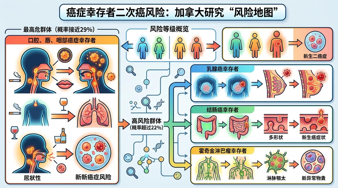 不是所有癌症幸存者都面临一样的风险。加拿大的研究画出了一张清晰的“风险地图”:口腔、唇和咽部癌症幸存者是最高危群体,30年内患上二次癌的概率接近29%;乳腺癌、结肠癌和霍奇金淋巴瘤幸存者紧随其后,概率都超过了22%。