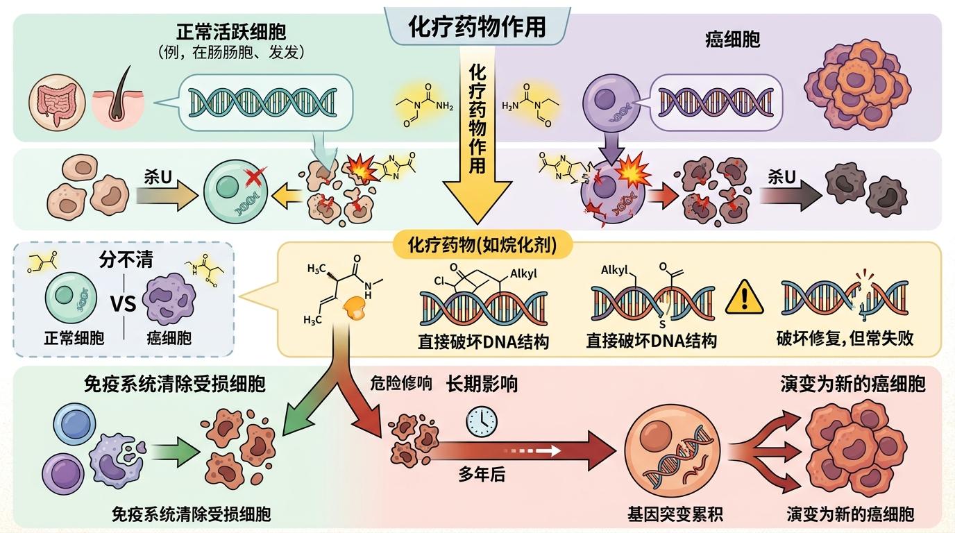 化疗的原理是用毒药毒死快速分裂的细胞,可它分不清癌细胞和肠道黏膜、毛囊这些正常的活跃细胞。更麻烦的是,像烷化剂这类化疗药会直接破坏DNA结构,就像在细胞的基因密码里乱涂乱画。如果这些受损细胞没有被免疫系统及时清除,就可能在多年后突变成为新的癌细胞。