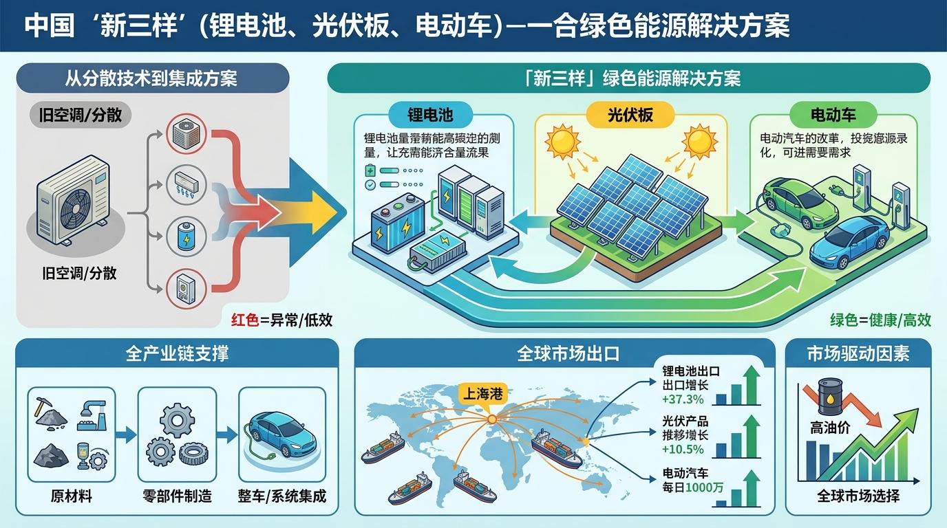 「新三样」不是凭空冒出来的热点,而是中国制造业升级的具象化——它把过去分散的锂电池、光伏板和电动车,拧成了一套能输出的绿色能源解决方案。就像家里的旧空调费电,你不会只换个节能外机,而是直接整套升级为冷暖一体的智能系统,上海正在给全球做这样的「能源升级」。一季度锂电池出口152.6亿元近乎翻倍,光伏产品增长96.6%,电动汽车每天有2700辆从上海港发往全球,背后是从原材料到整车的全产业链支撑,更是高油价下全球市场用脚投票的结果。