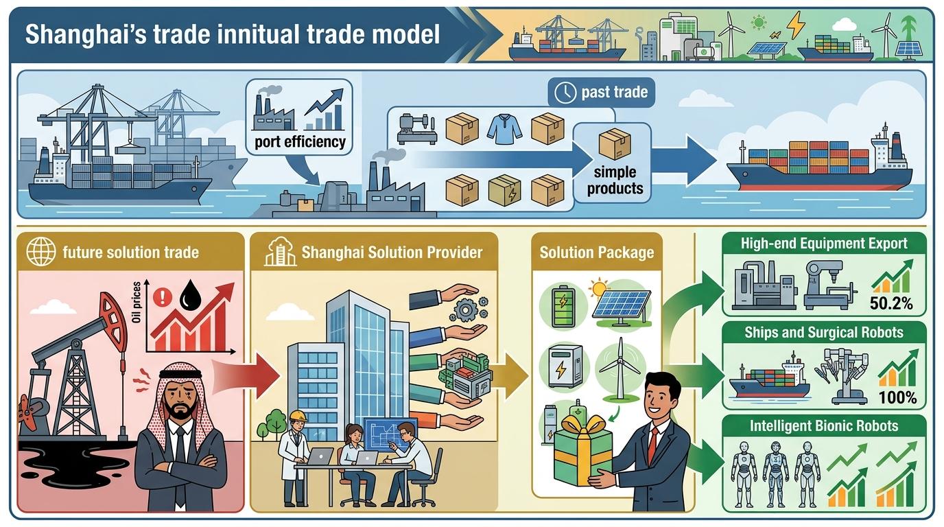 更值得关注的是,这场转型不止是产品的迭代,更是贸易逻辑的重构。过去上海外贸靠的是港口吞吐量和供应链效率,现在靠的是「问题解决能力」——当中东客户因为油价高企愁眉不展时,上海能递过去的不只是一块锂电池,还有从光伏电站到储能设备的整套方案。高端装备出口增长50.2%,船舶和手术机器人出口翻倍,智能仿生机器人月度规模连续翻番,这些数据都在指向同一个趋势:上海正在从「世界工厂的枢纽」,变成「高端制造的解决方案提供商」。
