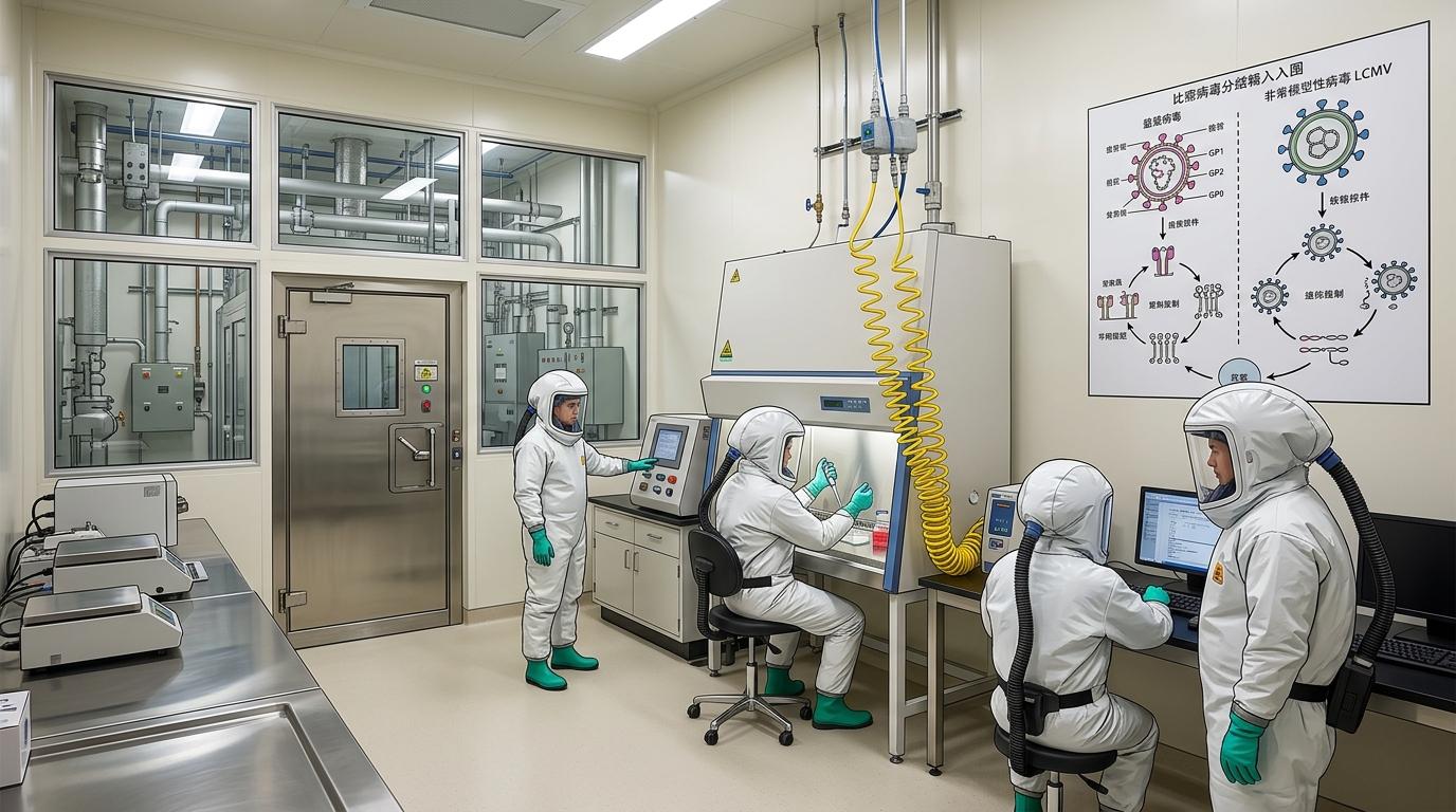 要研究拉沙病毒,必须进入像太空舱一样的P4实验室——穿正压防护服、呼吸靠外接氧气,每一个操作都要经过三重验证。为了绕开这个障碍,王薇团队先拿温和的模式病毒LCMV练手,这种病毒和拉沙病毒有着几乎一样的入侵逻辑。