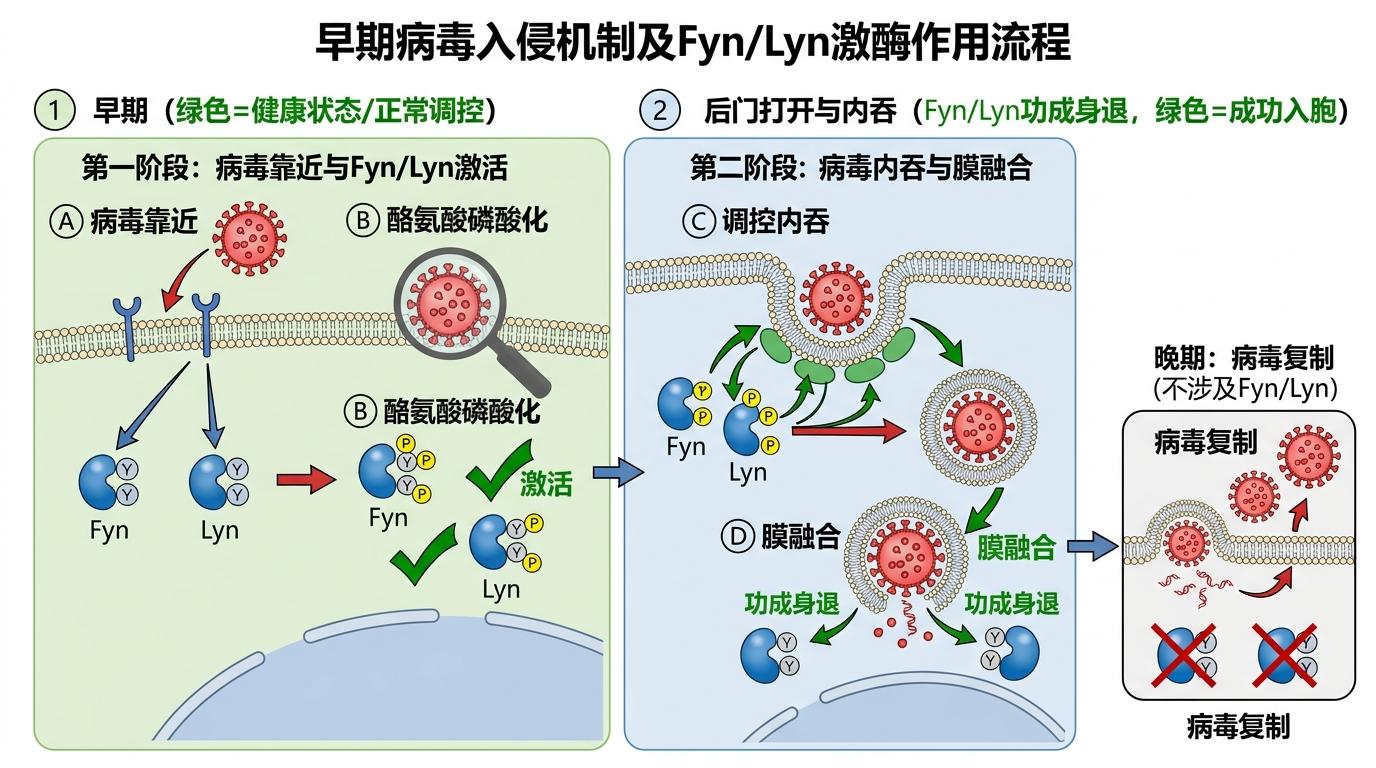 这种双重角色,给药物研发带来了挑战:如果只是单纯抑制Fyn和Lyn,虽然能阻断病毒入侵,但也可能削弱人体的免疫防御。未来的方向,或许不是完全抑制,而是‘精准调控’——比如只阻断病毒利用激酶的那部分功能,保留它们激活免疫的作用。