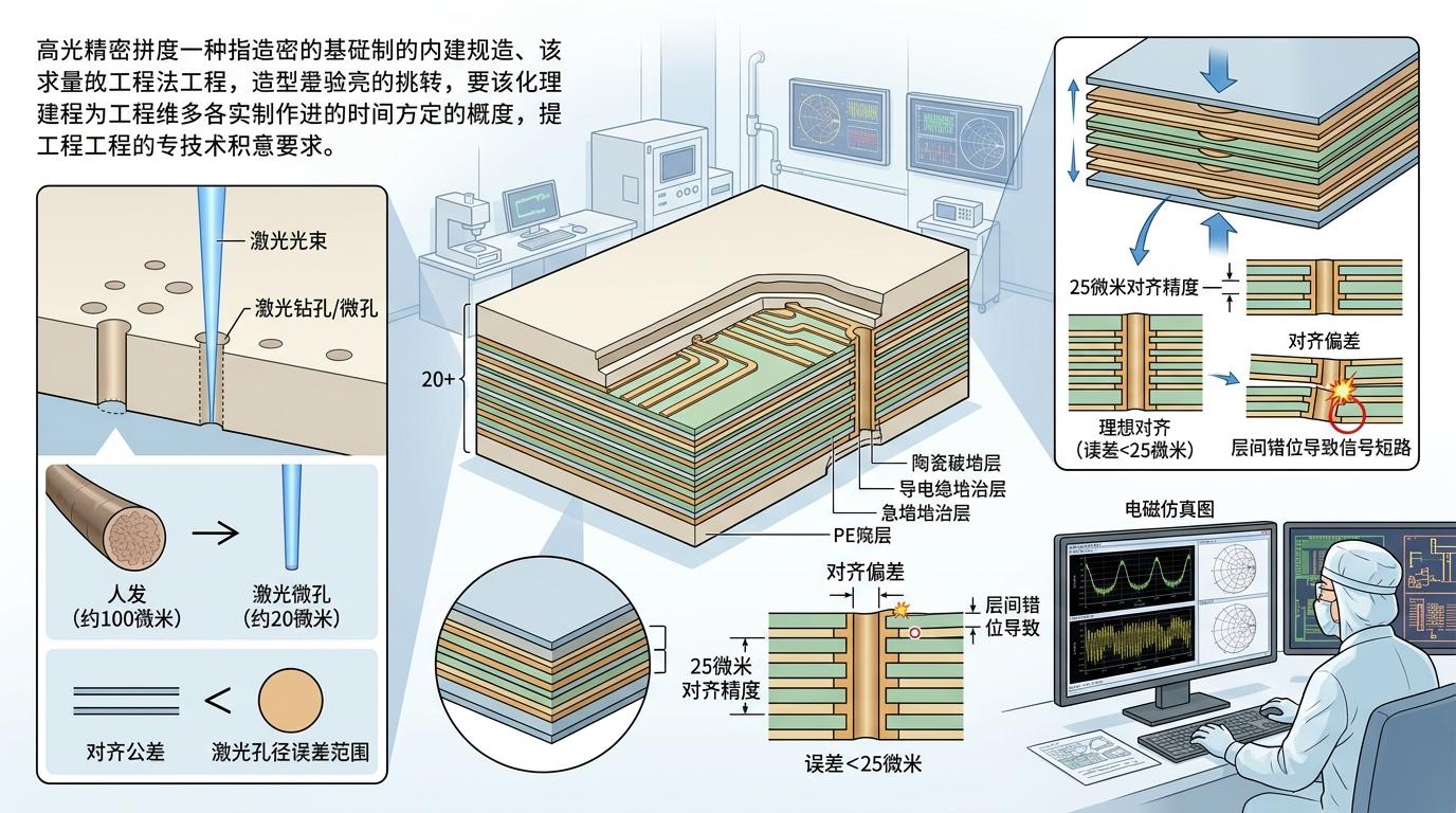 要造这样的基板,得先解决几个要命的问题:比如用激光钻出头发丝1/5粗细的微孔,误差不能超过一根头发的直径;比如把20多层电路板压合在一起,层与层的对齐精度要控制在25微米以内,差一点就会导致信号短路。这些工艺的设备单台就要上千万元,还得养着能看懂电磁仿真图的工程师——中小厂根本玩不起。
