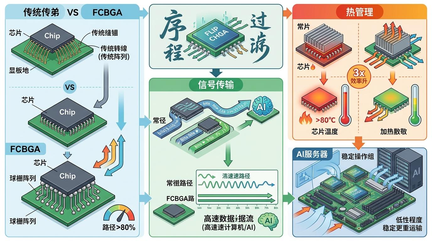 你可以把普通PCB想象成家里的插线板——只是把电子元件连起来,能通电就行,毛利率常年卡在15%,还得跟同行拼原材料和人工成本。但AI服务器用的FCBGA封装基板,完全是另一个物种。 FCBGA全称倒装芯片球栅阵列封装基板,说人话就是:把芯片“倒着”焊在电路板上,用密密麻麻的锡球代替传统的金属线连接。这一改,信号传输路径缩短了80%以上,能扛住AI芯片每秒几百G的高速数据流动,散热效率也提升了3倍——毕竟AI服务器满负荷运转时,芯片温度能飙到80℃以上。