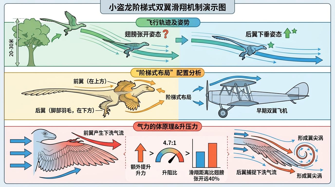实验显示,小盗龙的四翼并非简单的“两对翅膀”,而是呈“阶梯式双翼”布局:前翼在上,后翼(脚部的羽毛)在下,类似早期双翼飞机的设计。当它从20-30米高的树上滑翔时,前翼会产生下洗气流,而后翼能捕捉这股气流形成翼尖涡,额外提升升力。风洞测试中,它的后翼保持下垂姿态时,升阻比能达到4.7:1,滑翔距离比翅膀张开时远40%。