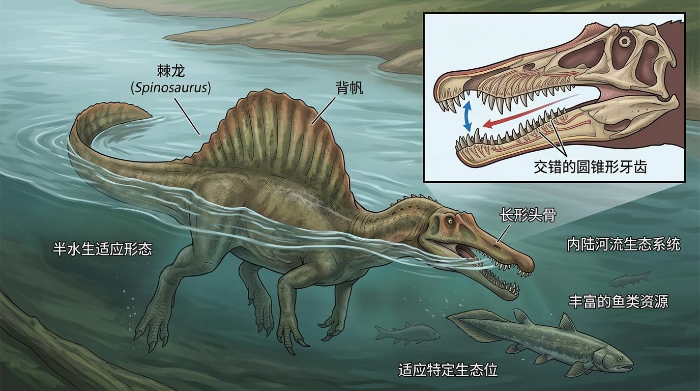 这背后是进化的核心逻辑:没有“完美”的形态,只有“适应”的选择。当环境出现空缺的生态位,总会有生物演化出对应的特征来填补。比如棘龙所在的晚白垩世内陆河流区域,鱼类资源丰富,而传统的陆生掠食恐龙不擅长捕鱼,棘龙的长嘴、交错牙齿和半水生形态,正是对这一生态位的适应。
