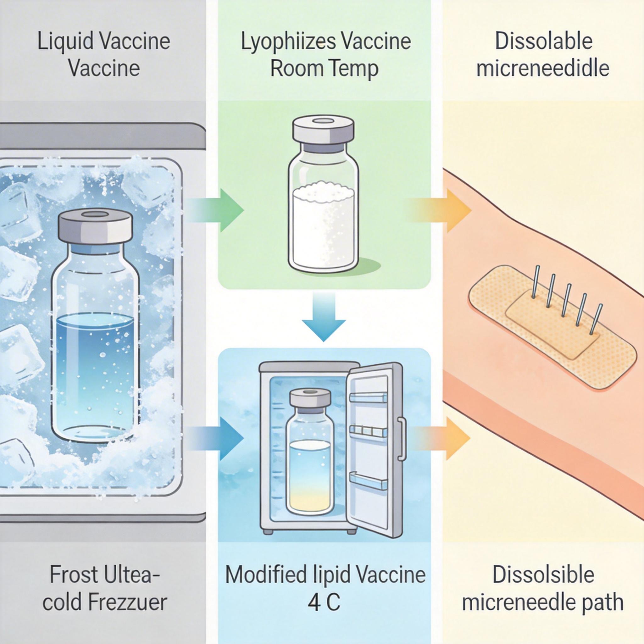 最紧迫的是解决冷链依赖。冻干技术是目前最成熟的方案——把疫苗里的水分抽干,做成粉末,就能在25℃的常温下保存半年以上。MIT团队还在优化脂质结构,他们把传统的线性叔胺改成环状的哌啶基团,减少了脂质氧化产生的杂质,让液态疫苗在4℃下能稳定存放5个月,不用再依赖超低温冰箱。还有微针贴片,把疫苗做成像创可贴一样的贴片,贴在皮肤上就能自行溶解,不仅不用专业医护人员,还能在室温下稳定保存,简直是为偏远地区量身定做的。