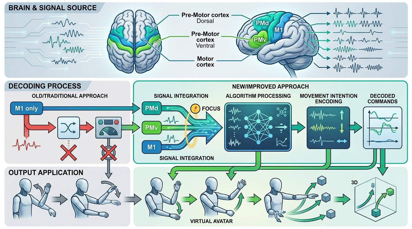 核心的突破,藏在脑信号的解码逻辑里。我们可以把大脑比作一个指挥乐团:初级运动皮层M1是负责动手的乐手,而背侧、腹侧前运动皮层PMd和PMv,是提前规划乐谱的指挥。以往的脑机接口常盯着M1的信号,就像只听乐手的演奏,却忽略了指挥的意图。这次的研究发现,PMd和PMv的神经信号,才是解码运动意图的关键——它们编码的是“要往哪走”的规划,而非“怎么动胳膊”的执行。研究者用偏好子空间识别算法,从海量神经信号里提炼出这些规划意图,再转化为虚拟化身的三维运动指令,就像把指挥的乐谱直接翻译成了舞台上的舞步。