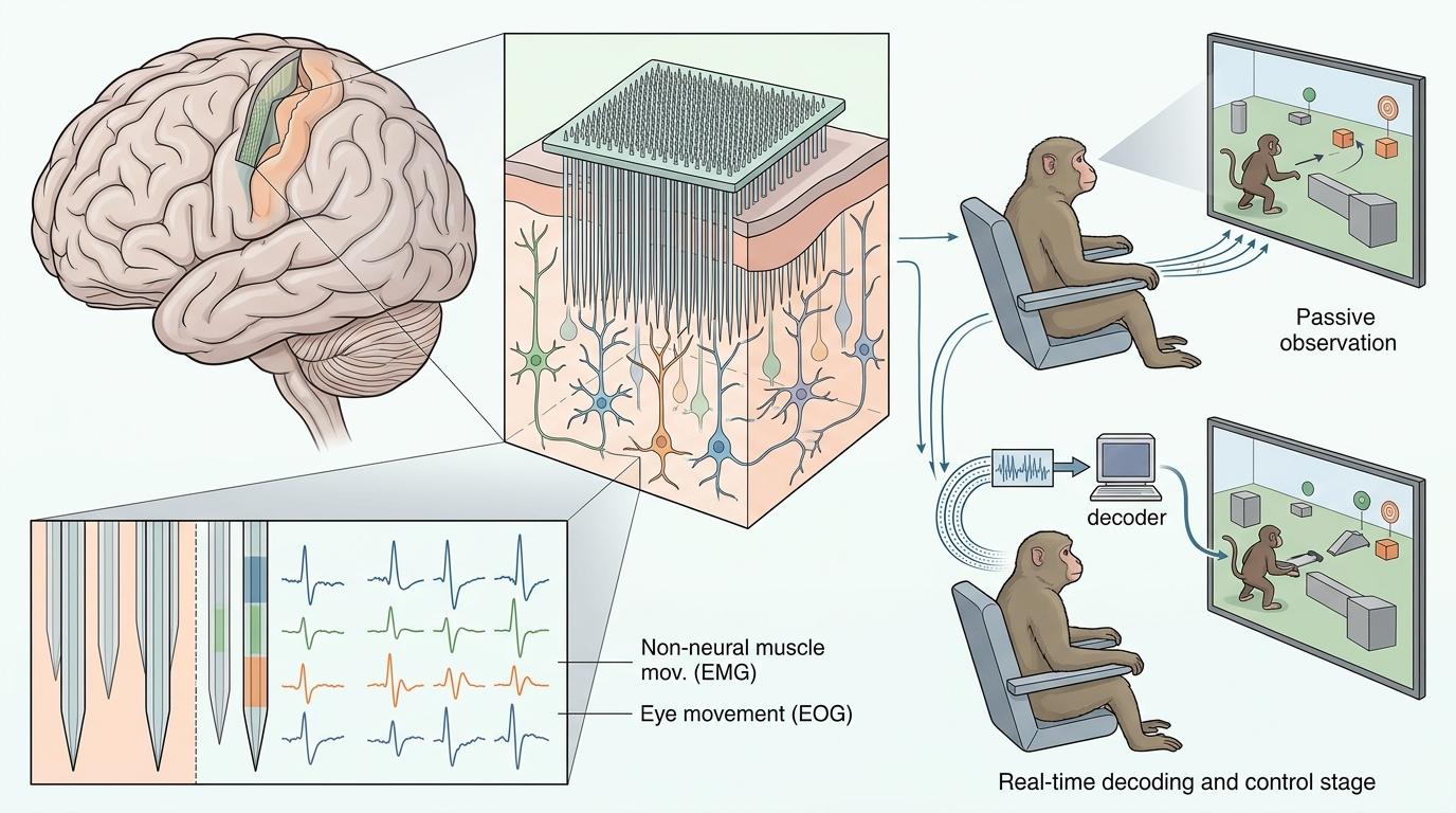 要解开这个谜题,得先看清实验的全貌。研究者给三只恒河猴的运动相关脑区,植入了高密度的Utah电极阵列——这种像微型针阵的设备,能精准捕捉单个神经元的放电信号。不同于以往需要猴子反复主动训练的模式,这次他们用了更巧妙的方法:先让猴子被动观看虚拟化身的运动,同时记录下大脑里对应的神经活动,再用这些数据训练解码算法。短短7分钟的观察后,猴子就能仅凭脑信号,驱动虚拟化身完成连续导航、避障、目标切换等五种复杂任务,且排除了肌电、眼动的干扰,真正实现了“用思想控制”。