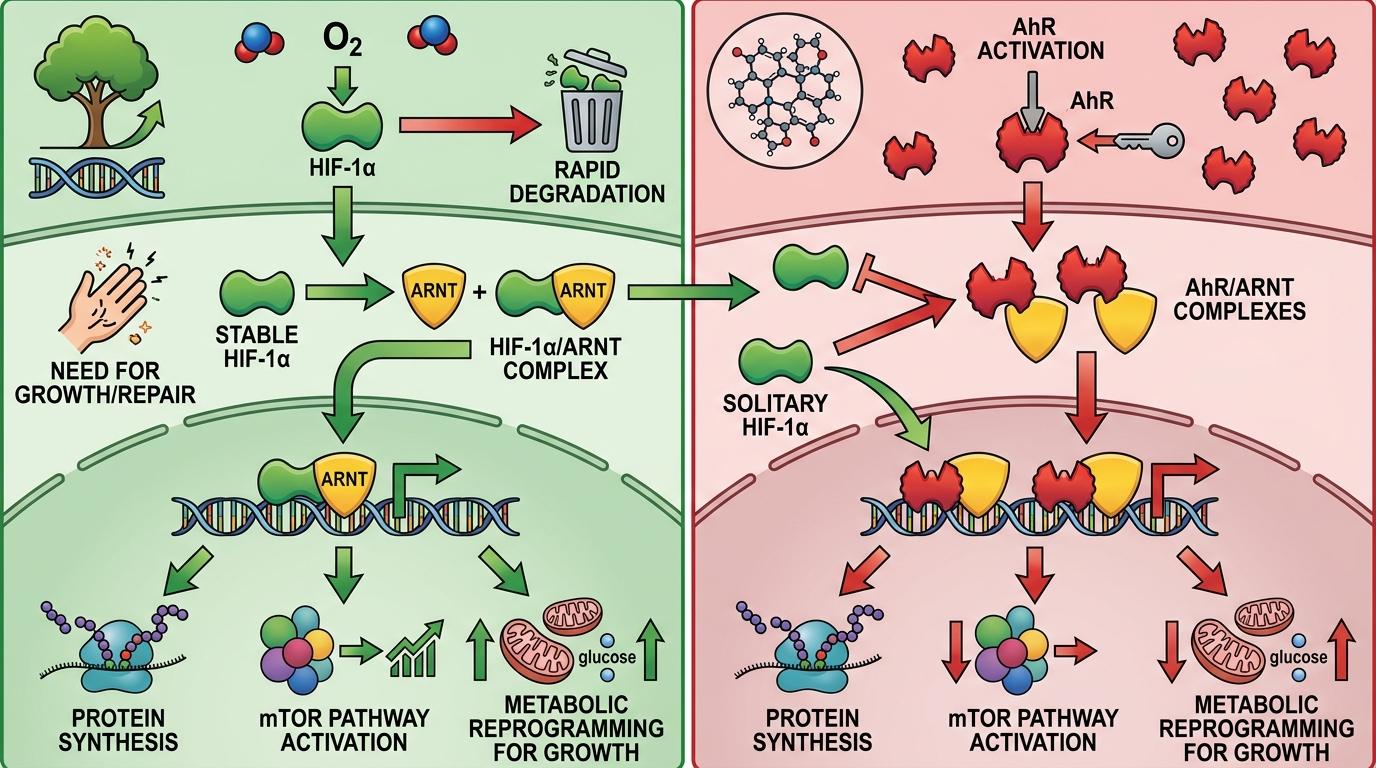 HIF-1α是细胞里的「生长总指挥」,平时在氧气充足的环境下会被快速降解,但一旦细胞需要生长或修复(比如神经损伤后),它就会稳定下来,和ARNT结合,启动一系列促生长基因:促进蛋白质合成、激活mTOR通路、调控代谢为生长供能。而AhR激活后,会抢先和ARNT结合,把这个关键搭档牢牢攥在手里,让HIF-1α找不到合作伙伴,只能待在细胞质里无所事事。