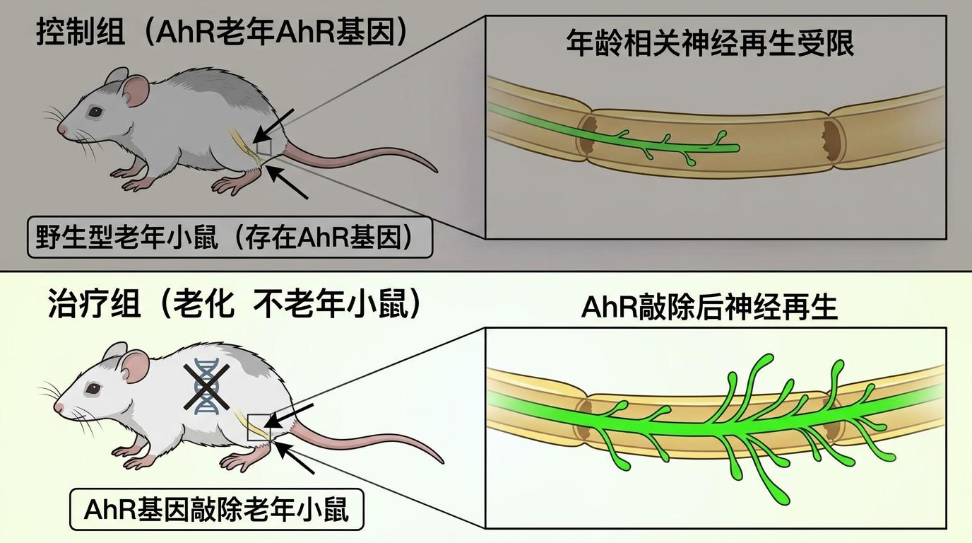 实验数据最有说服力:在小鼠坐骨神经损伤模型中,被敲除AhR基因的小鼠,轴突最长再生长度从1.06毫米跃升至1.44毫米,提升了36%;运动功能恢复时间直接缩短了三分之一。更关键的是,这种效果在老年小鼠身上同样显著——原本因年龄增长而近乎停滞的神经再生,在松开AhR刹车后,恢复到了年轻小鼠70%的水平。