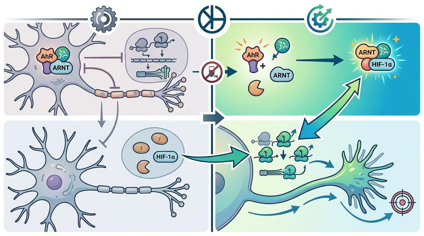 你可以把AhR想象成神经元里的「应急总指挥」。它原本的工作是感知进入体内的环境毒素,比如多环芳烃、二恶英,然后启动解毒程序——让细胞优先合成清理毒素的蛋白,暂停一切非必要的生长活动。这在平时是保护机制,但当神经受伤时,这个机制就成了灾难。