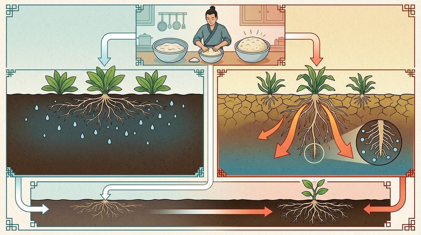 这就是植物学里的「适度水分胁迫」——不是让植物渴到脱水,而是给土壤留一段干透的间隙,逼着根系向下深扎。就像厨房发面,太湿的面团只会瘫软,略干一点才会扎实地膨胀。植物的根尖会感知土壤的水分梯度,主动向更深更湿润的土层生长,同时分泌更多根毛,把土壤里的每一点水分都抓牢。