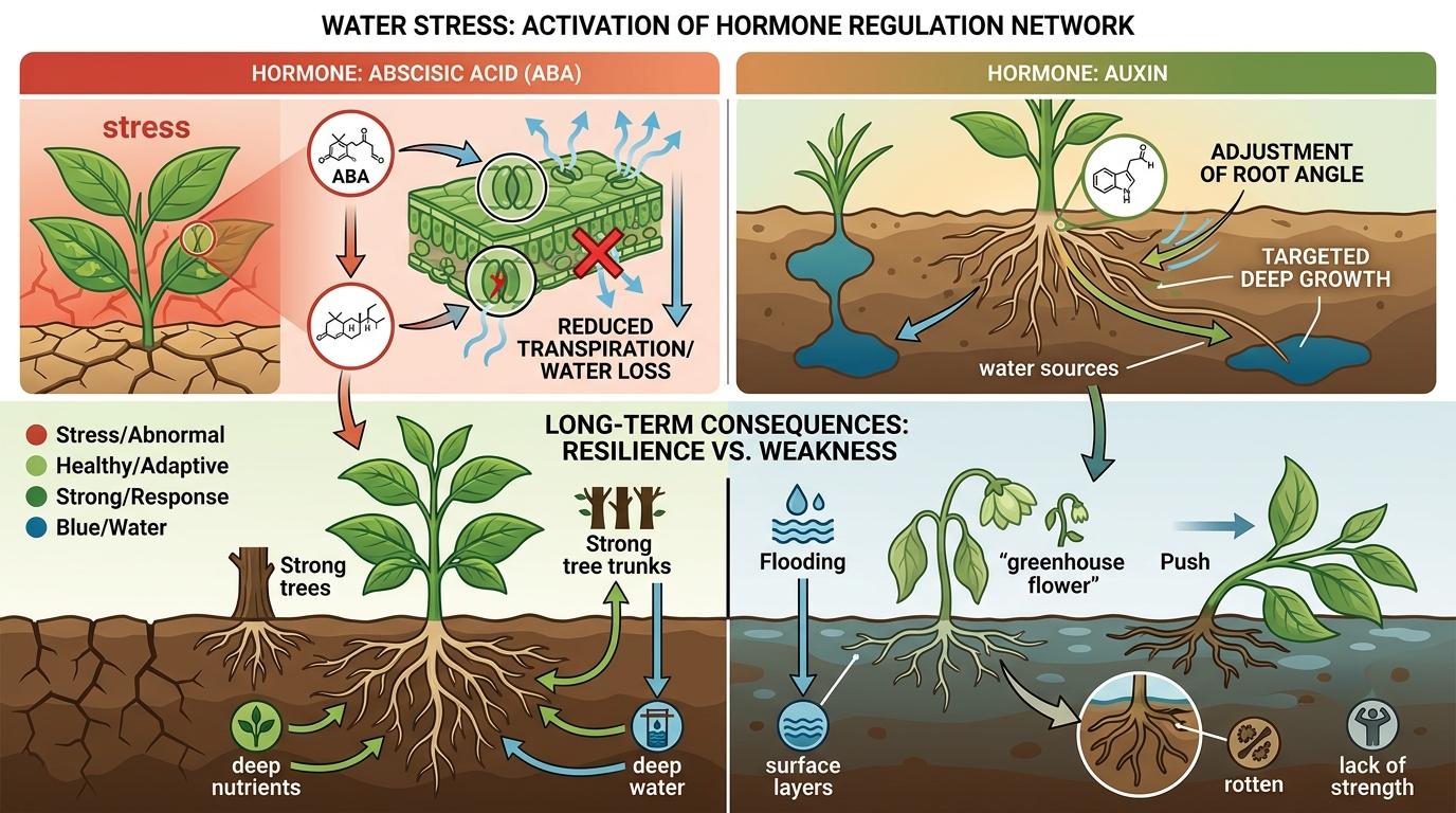 更关键的是,这种胁迫会激活植物的激素调控网络。脱落酸会关闭叶片上的部分气孔,减少水分蒸腾浪费;生长素会引导根系调整生长角度,专门往有水的地方钻。而那些被过度浇水的植物,根系只会浮在表层,既抓不住深层养分,又容易被积水闷烂,最后变成一碰就倒的「温室花朵」。