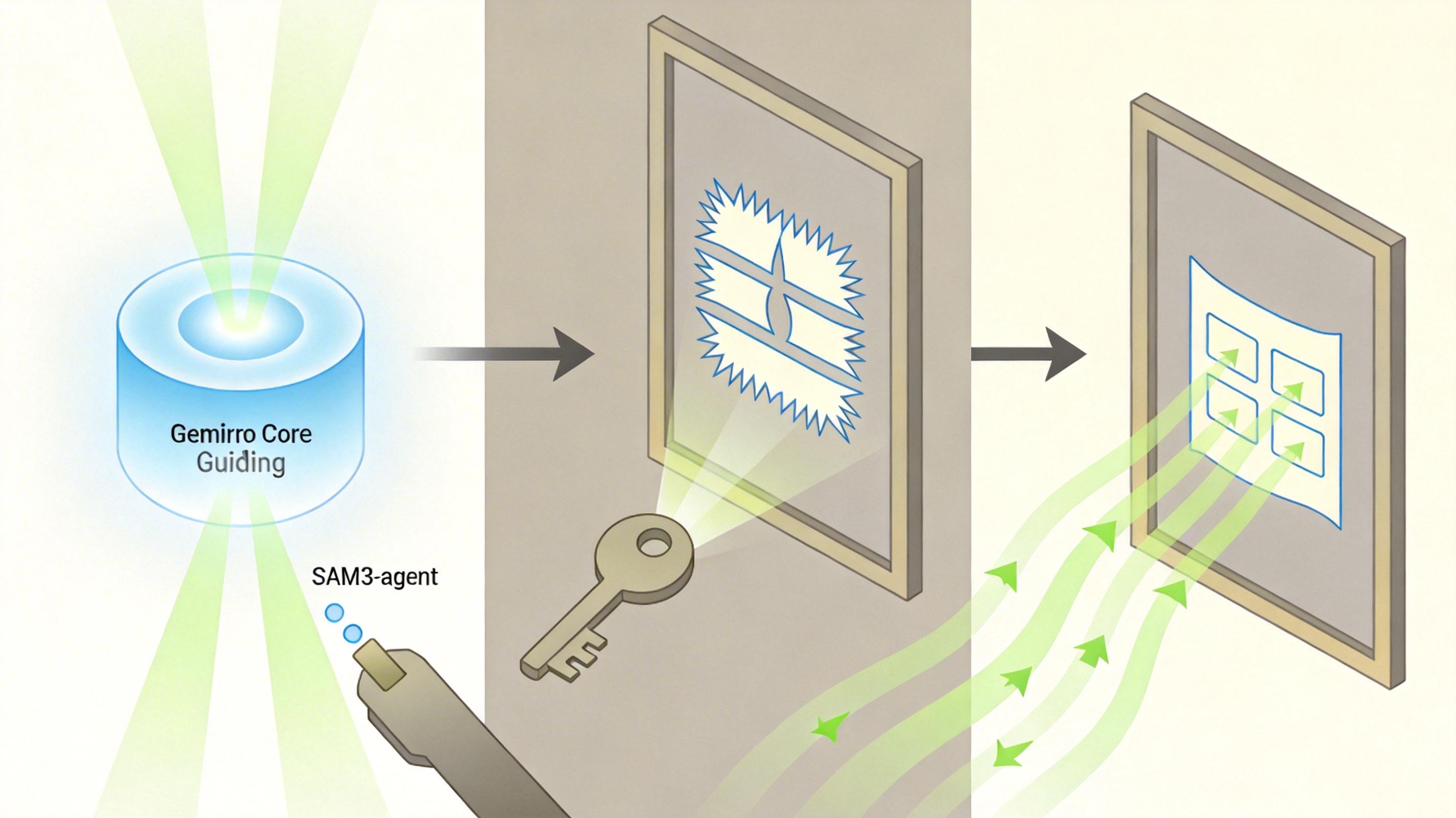 第二阶段是“执行”:Meta的SAM3上场。这里用的是SAM3-agent,它不是简单的输入文字出结果,而是像个有规划能力的工人:由Gemini指导它调用工具箱里的工具,比如“点这里”“画个框”,经过多轮交互生成精准的种子掩码。拿到关键帧的种子掩码后,SAM3自带的跟踪器会把这个掩码逐帧传播到整个视频,完成动态跟踪。