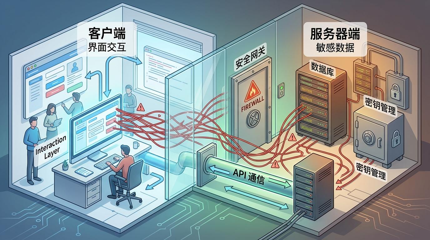 全栈开发的核心矛盾,在于客户端与服务器的「职责分裂」:客户端负责界面交互,服务器管着数据库、密钥这些敏感操作——两者本该像隔着一道防火墙的两个房间,只能通过指定门(API)通信。但实际开发中,代码的导入关系像无形的线,很容易把服务器房间的东西勾到客户端。