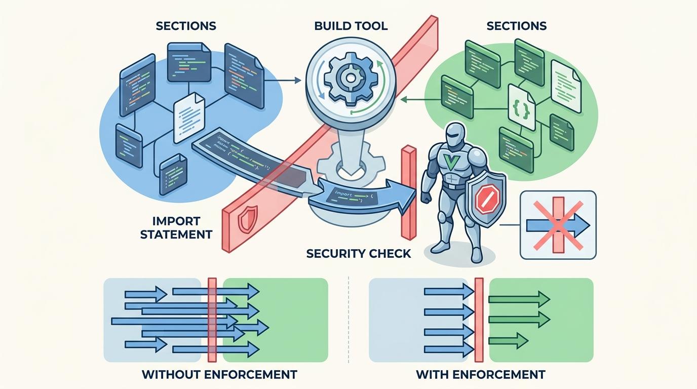 新的导入保护机制,把「自律」变成了「强制」。它以Vite插件的形式运行,在开发和构建的每一步,都盯着代码里的每一条导入语句——就像个严格的保安,查每一个试图跨区的人。